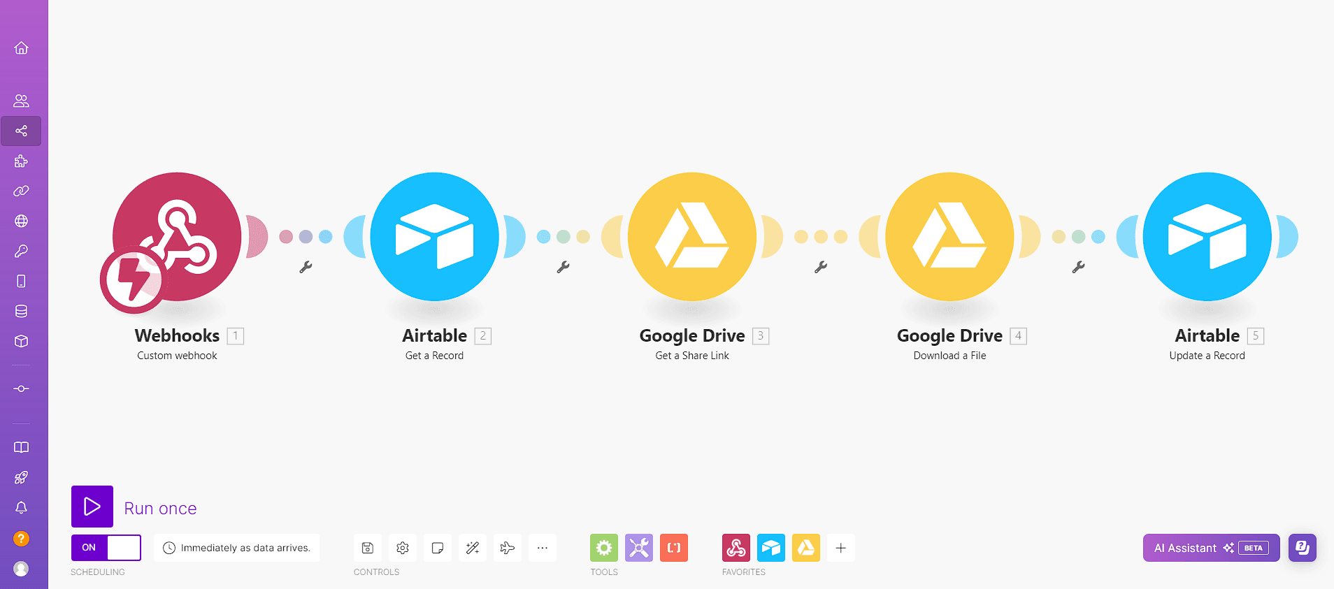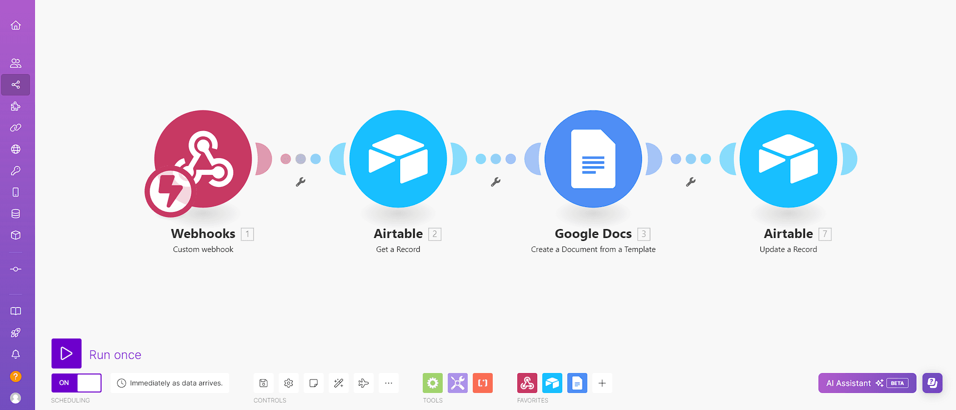 Make.com : Similaire à Zapier, Make (ex. Integromat) permet aux utilisateurs de créer des workflows complexes sans écrire de code. Il prend en charge la génération de documents grâce à des intégrations avec différents services comme Google Docs, PDF.co et d'autres.